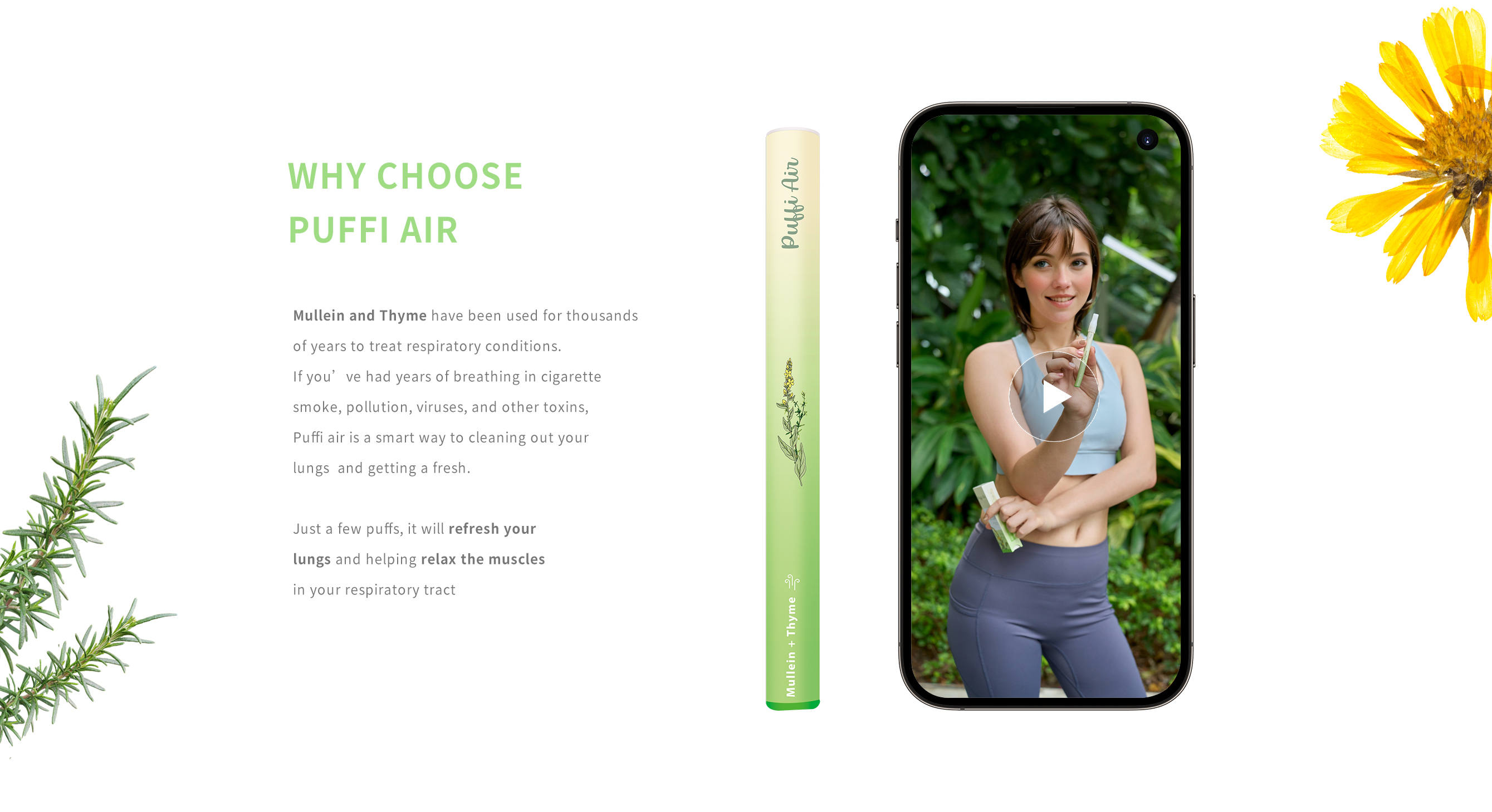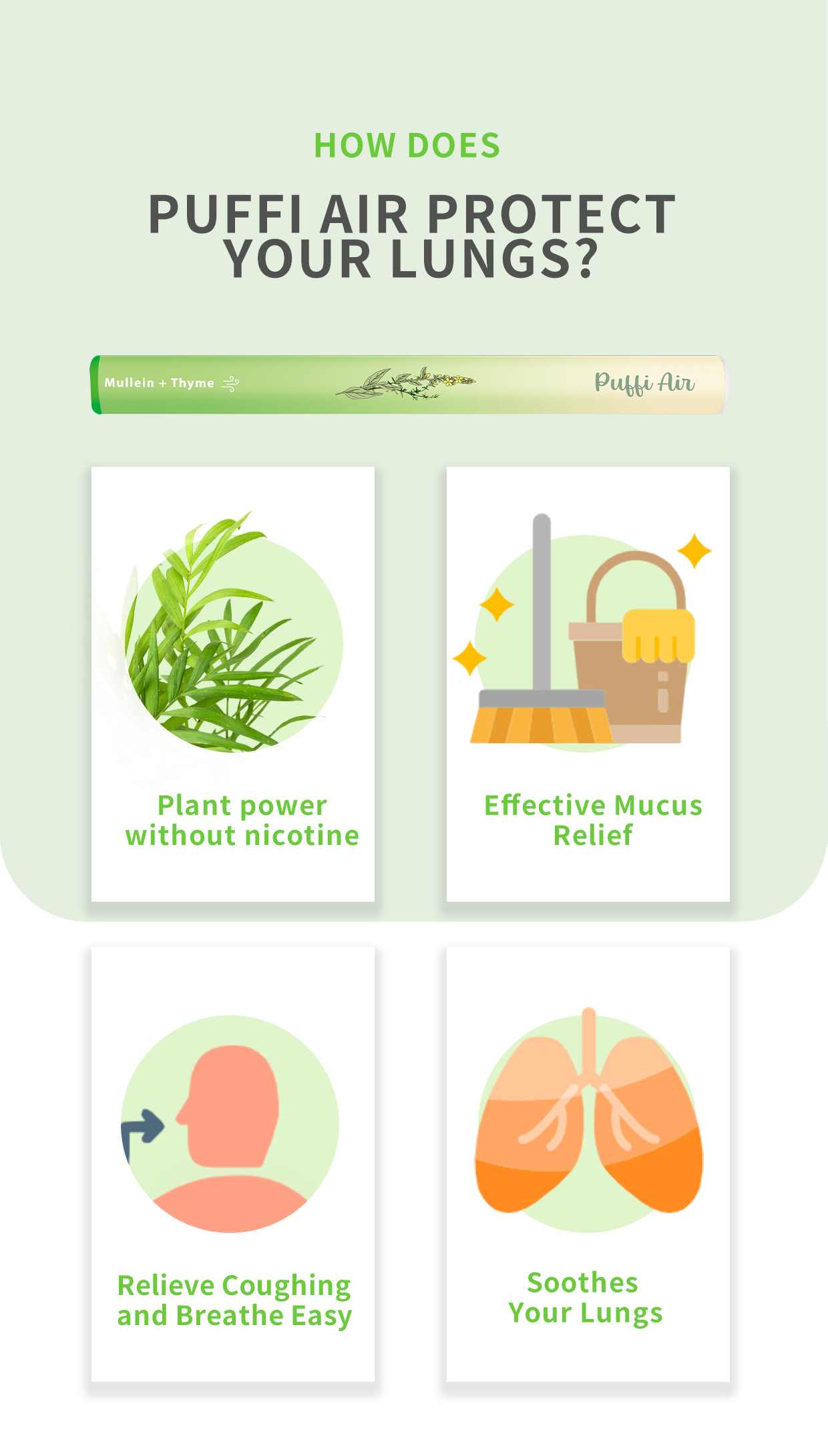Mullein and Thyme have been used for thousands of years to treat respiratory conditions. If you’ve had years of breathing in , pollution, viruses, and other toxins, Puffi air is a smart way to clean out your lungs and getting a fresh.