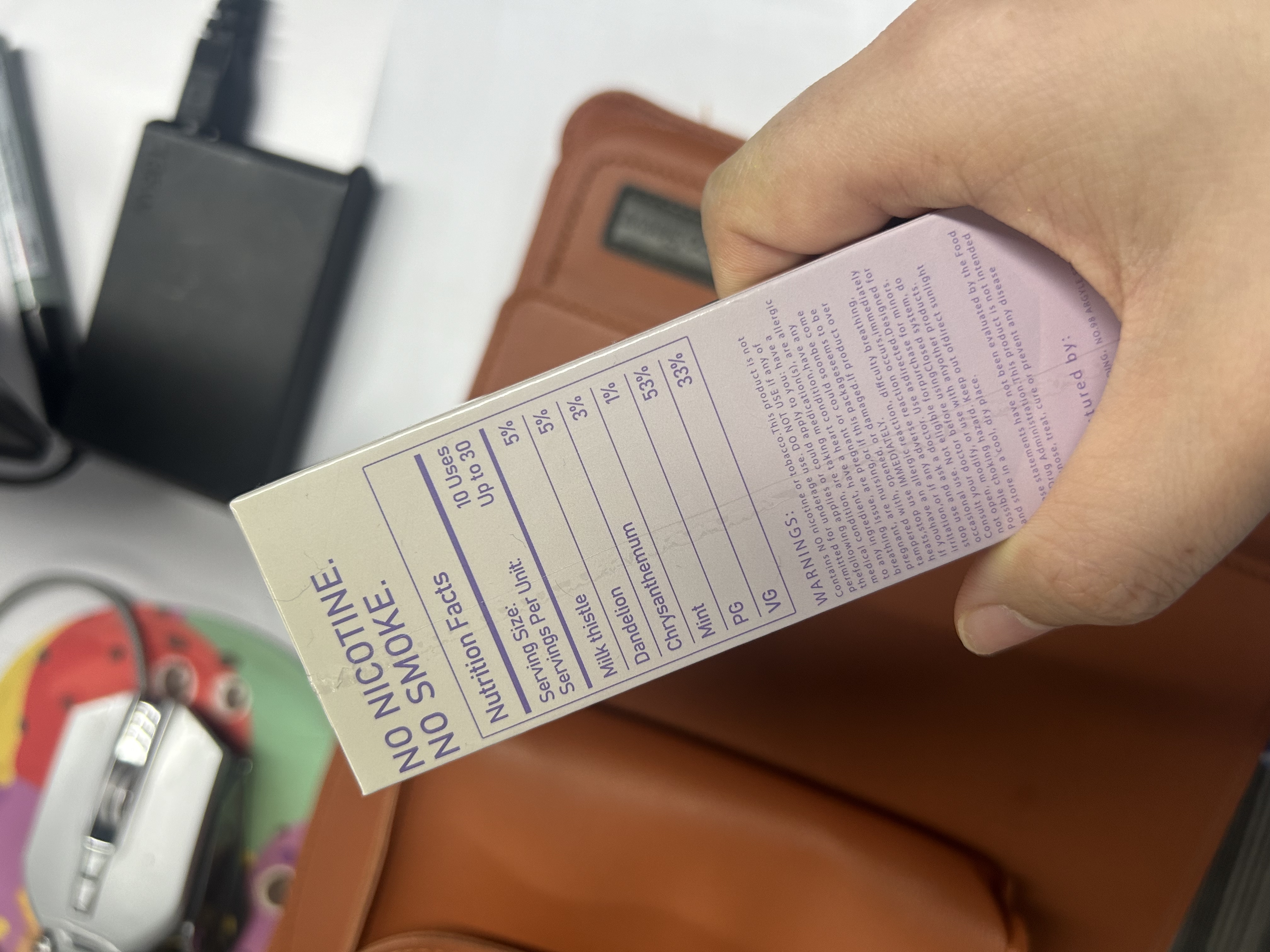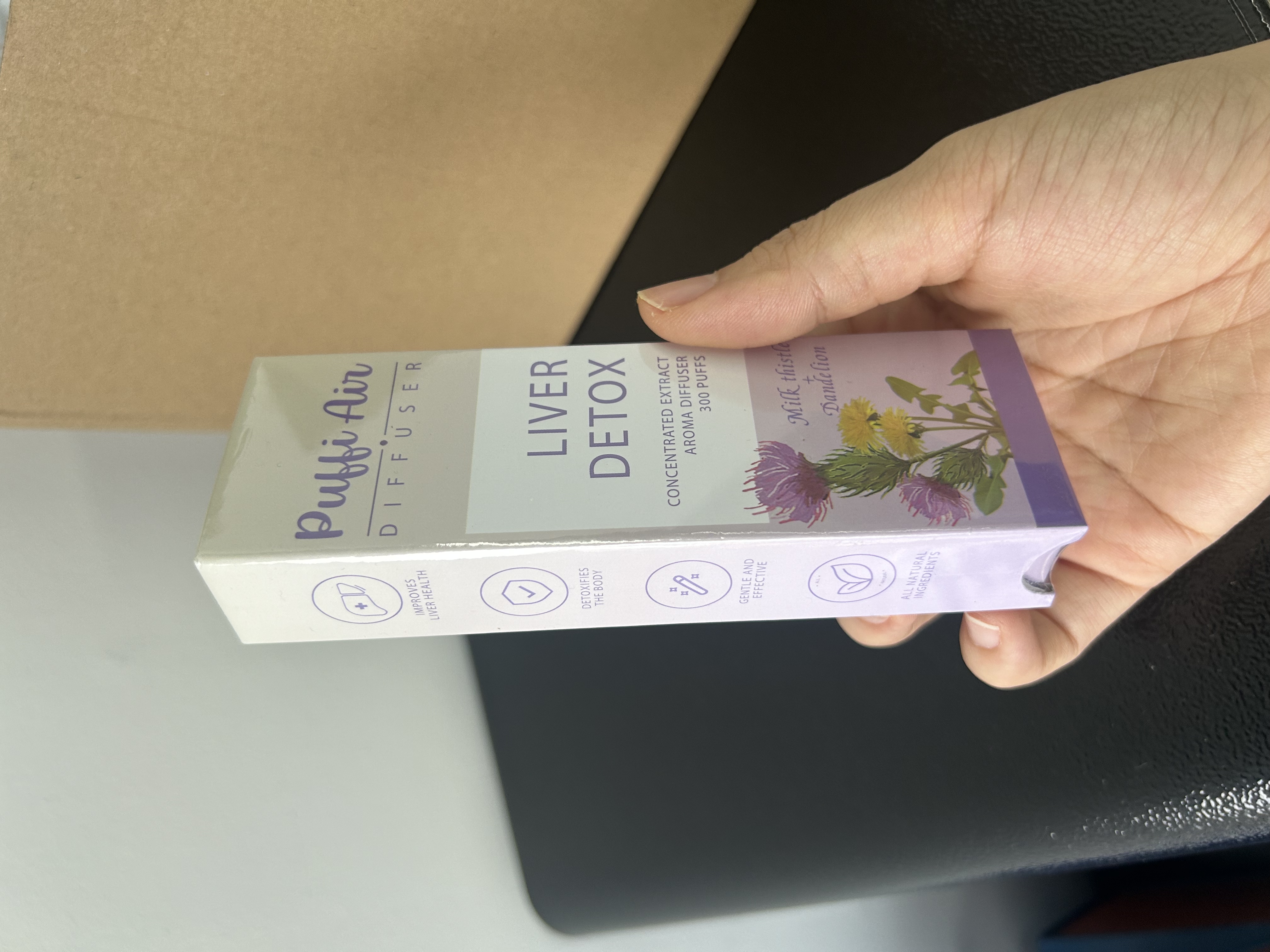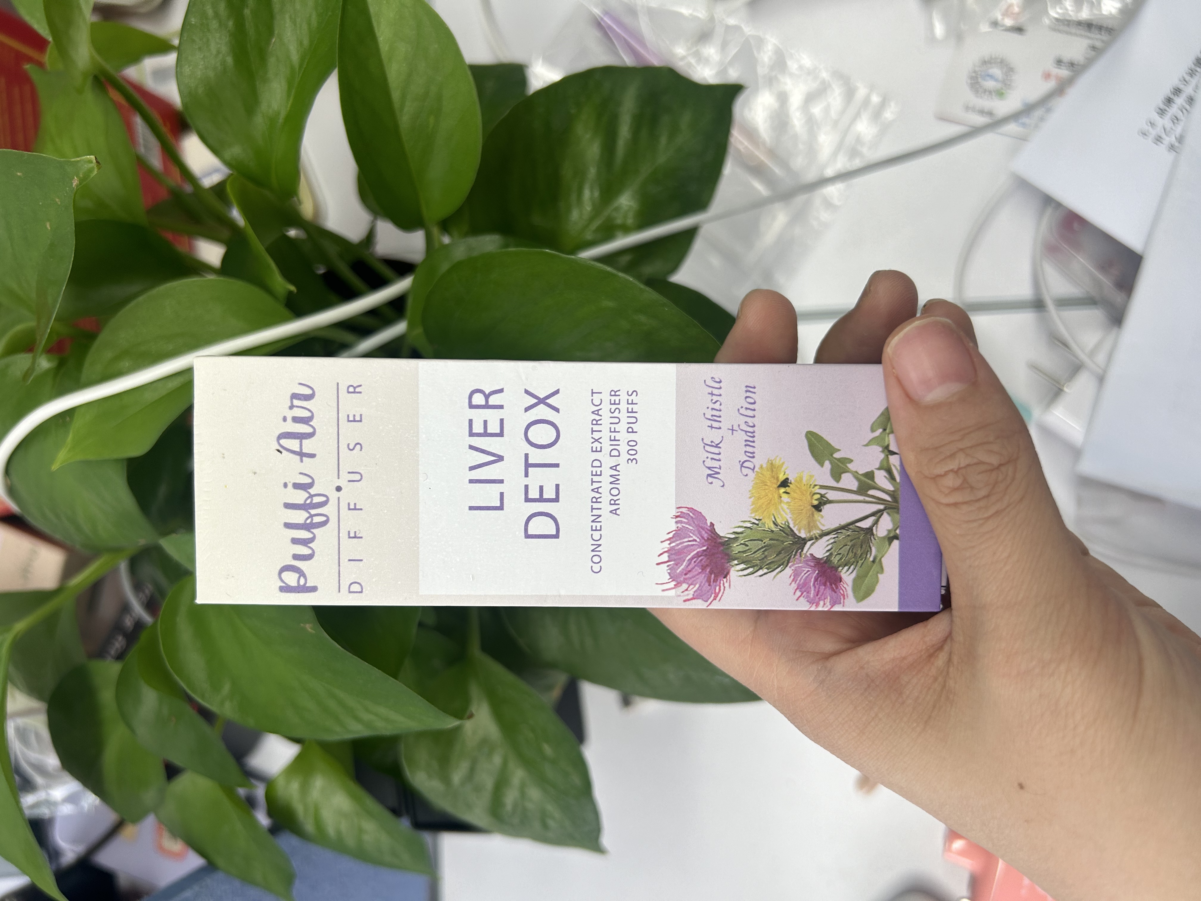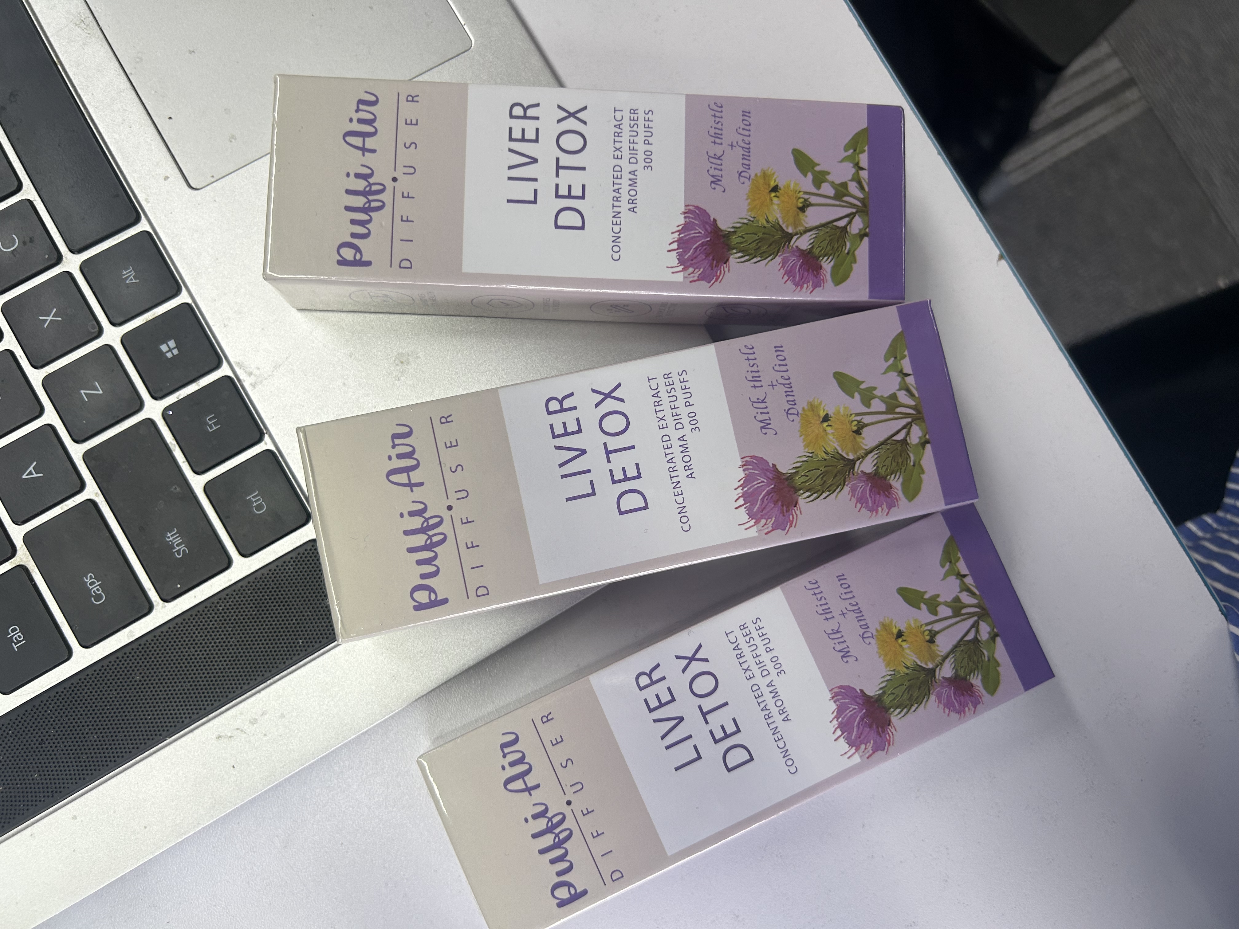 This aroma diffuser contains 1.5ml of a powerful formula that provides 300 puffs per pack - perfect for adults looking to improve their overall health & well-being. Its single-item pack type makes it easy to use on the go or at home.The Nutrition Facts Include:Milk thistle-5%Dandelion-5%Chrysanthemum-3%Mint-1%PG-53%VG-33%Puffi Air Liver Detox Aroma Diffuser is an all-natural way to promote liver health while enjoying the benefits of aromatherapy whenever you need it most! -